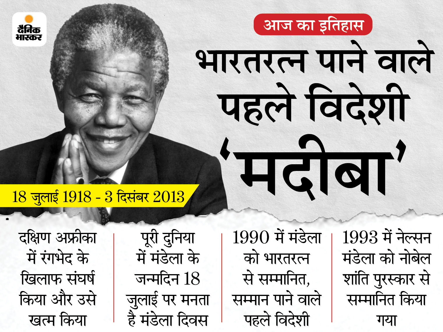 भारत में जो सम्मान महात्मा गांधी को मिलता है, उतना ही सम्मान दक्षिण अफ्रीका में नेल्सन मंडेला को मिलता है। इसी वजह से तो उन्हें अफ्रीका का गांधी भी कहते हैं। मंडेला ने 27 साल जेल में रहकर रंगभेद की नीतियों के खिलाफ लड़ते हुए न केवल श्वेत-अश्वेत के बीच की खाई को पाटा बल्कि 10 मई 1994 को पहले अश्वेत राष्ट्रपति के तौर पर दक्षिण अफ्रीका में नए युग का सूत्रपात किया। आज उनका जन्मदिन पूरी दुनिया में रंगभ... | Today History, Aaj Ka Itihas (इतिहास में आज) Bharat Mein Aaj Ka Itihaas | What Is The Significance Of Today? What Famous Thing Happened On This Day In history; भारत में जो सम्मान महात्मा गांधी को मिलता है, उतना ही सम्मान दक्षिण अफ्रीका में नेल्सन मंडेला को मिलता है। इसी वजह से तो उन्हें अफ्रीका का गांधी भी कहते हैं। मंडेला ने 27 साल जेल में रहकर रंगभेद की नीतियों के खिलाफ लड़ते हुए न केवल श्वेत-अश्वेत के बीच की खाई को पाटा बल्कि 10 मई 1994 को पहले अश्वेत राष्ट्रपति के तौर पर दक्षिण अफ्रीका में नए युग का सूत्रपात किया। आज उनका जन्मदिन पूरी दुनिया रंगभेद को मिटाने के प्रतीक के तौर पर मनाया जाता है।