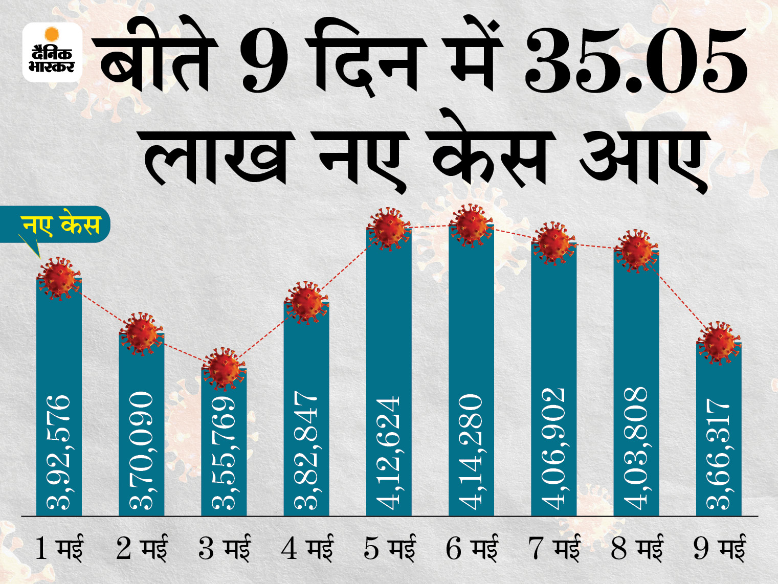 देश में कोरोना की दूसरी लहर के बीच सोमवार को राहत भरी खबर आई। नए मरीजों का आंकड़ा 5 दिन में पहली बार 4 लाख से नीचे आ गया। बीते 24 घंटे में यहां 3 लाख 66 हजार 317 लोगों में कोरोना की पुष्टि हुई। 3 लाख 53 हजार 580 लोग ठीक भी हुए, जबकि 3,747 लोगों ने जान गंवाई। इस तरह एक्टिव केस, यानी इलाज करा रहे मरीजों की संख्या में सिर्फ 8,907 की बढ़ोतरी हुई। यह बीते 55 दिन में सबसे कम है। इससे पहले 15 मार्च को 4,10... | Lockdown: Coronavirus Outbreak India Cases, Vaccination LIVE Update | Maharashtra Pune Madhya Pradesh Bhopal Indore Rajasthan Uttar Pradesh Haryana Punjab Bihar Novel Corona (COVID 19) Death Toll India Today, Mumbai Delhi Coronavirus News