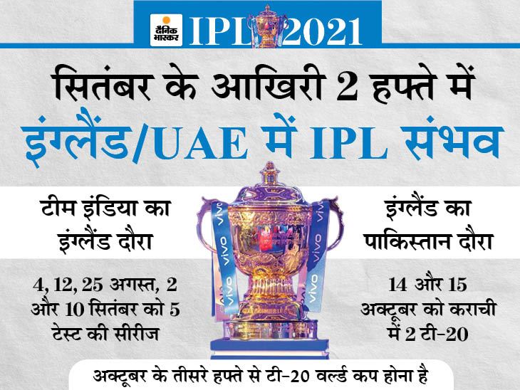 कोरोना के कारण IPL 2021 सीजन 4 मई को बीच में ही सस्पेंड कर दिया गया। टूर्नामेंट में अब तक सिर्फ 29 मैच हुए और 31 मुकाबले बाकी हैं। ऐसे में IPL को पूरा करने के लिए BCCI करीब 20 दिन की विंडो तलाश रही है। टाइट शेड्यूल और कोरोना के चलते यह विंडो सितंबर-अक्टूबर में होने की पूरी संभावना है। कोरोना के चलते टूर्नामेंट UAE या इंग्लैंड में हो सकता है। यदि ऐसा होता है, तो पाकिस्तान को बड़ा नुकसान हो सकता है। | IPL 2021 Suspended UAE Update; Tournament Possible By October Second Week as England Can Postpone Pakistan Tour